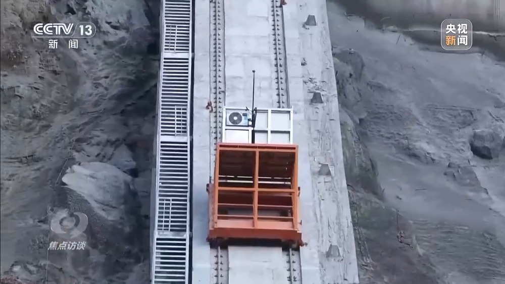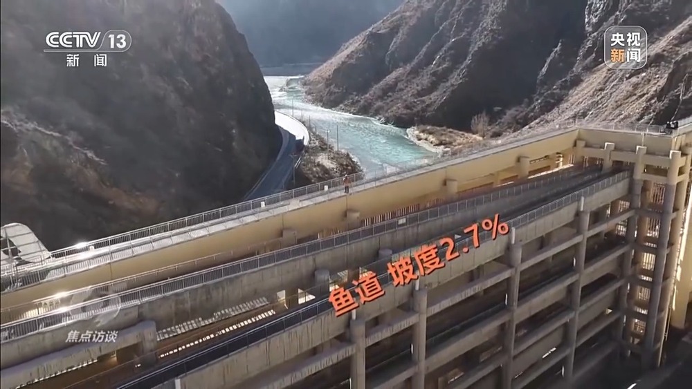 中国电建集团成都勘测设计研究院叶巴滩水电站设计副总工程师 蒙富强:叶巴滩水电站上下游水位落差非常大,有173米,用常规的鱼道很难保证鱼上溯过坝。因此,我们采用轨道式的提升系统,利用生态尾水在进口形成水流,同时在出口地方有一个灯光把鱼类吸引到集鱼槽里面,然后通过集鱼斗把鱼收集到一定数量,利用起吊设备,把集鱼斗从集鱼槽的底部提升到2楼分拣室。